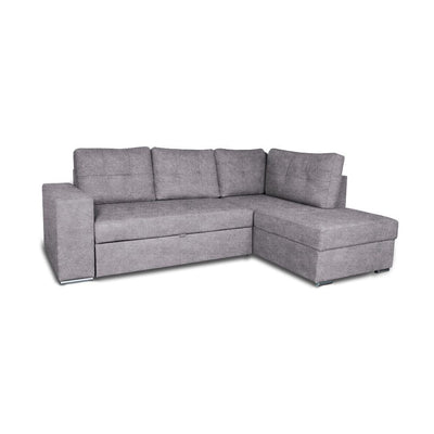 Divano letto Dugo con penisola contenitore reversibile in tessuto Mina 07 tortora e piedini cromo