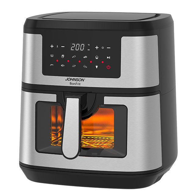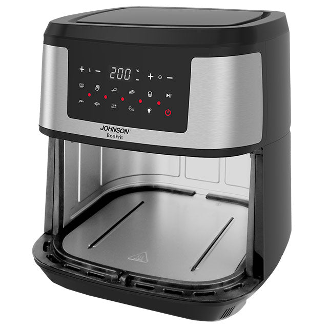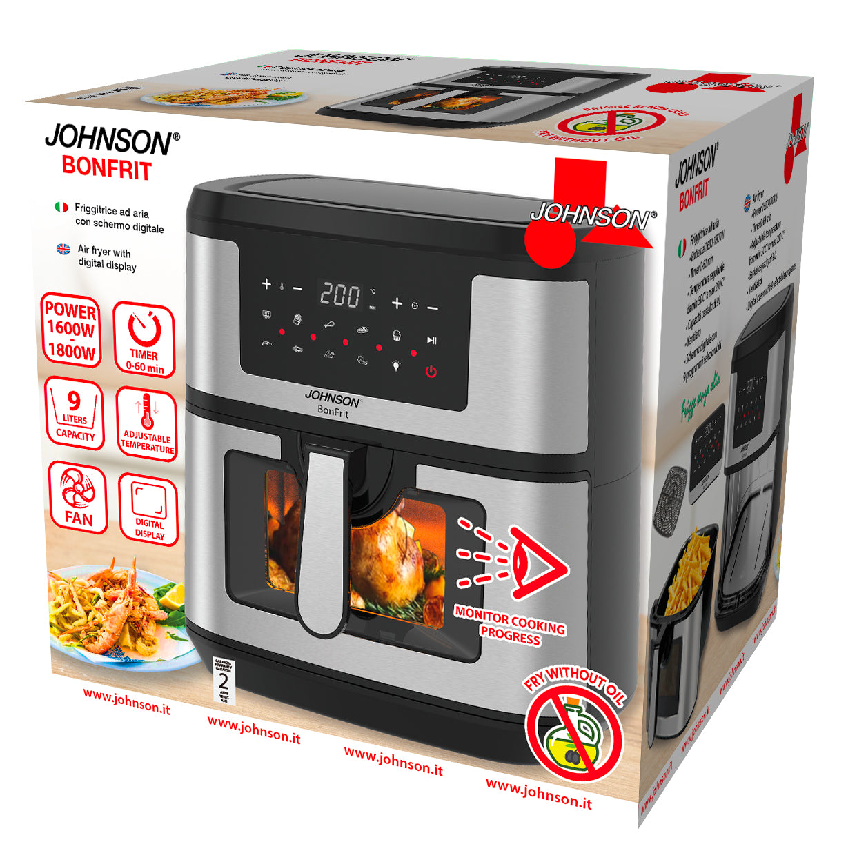 Johnson BonfritBONFRIT di JOHNSON è una friggitrice dalla potenza di 1800W e allo stesso tempo un forno digitale ad aria calda che permette di cucinare in modo sano e senza rinunciare al sapore.Grazie ai pratici accessori cuoce, arrostisce, frigge e scongela qualsiasi alimento.Con una capacità di 9L. consente di cuocere grandi quantità di cibo.L’innovativa tecnologia Air Freyer che fa circolare l’aria calda velocemente e a 360°, riscalda la temperatura fino a 200°C permettendo di cucinare rapidamente e senza l’uso di condimenti (olio o burro) per piatti leggeri, gustosi e croccanti.La ventola posizionata sopra la resistenza distribuisce il calore in modo uniforme per cotture ultrarapide e in contemporanea senza avere un inutile spreco di energia.BONFRIT è completamente digitale con la possibilità di regolare la temperatura da 50°C a 200°C ed un tempo di funzionamento da 0 a 60 minuti oltre ad avere 9 programmi preimpostati per facilitare la cottura.Tutti gli accessori possono essere comodamente lavati in lavastoviglie.DATI TECNICI:FRIGGITRICE AD ARIAPotenza. 1600W-1800WFrigge senza olioSchermo digitaleTemperatura regolabile 50°C – 200°CCapacità cestello: 9LVentilatoTimer 0 – 60 minuti9 programmi selezionabiliColore: Nero/Acciaio