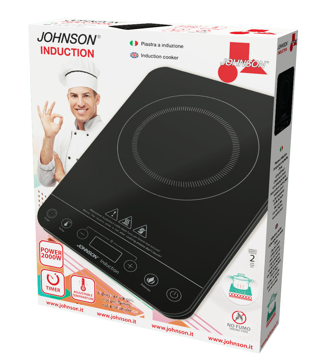 INDUCTION di JOHNSON è un comodo piano di cottura a induzione, con una potenza massima di 2000 W, ideale per coppie moderne e piccole famiglie. La particolarità è la possibilità di cottura programmata, in questo modo potrete scegliere la potenza o temperatura che desiderate assieme al tempo di cottura, affinché i vostri piatti cuociano perfettamente per il tempo previsto. Questa funzione si rivela molto pratica per la cottura di pasta o per la cottura al vapore delle verdure. INDUCTION è dotato di una temperatura minima per tenere a caldo costante acqua o qualsiasi altro piatto una volta cotto. La regolazione dei diversi parametri di cottura avviene tramite la superficie touch della piastra. Pensata e creata per pentole di diametro tra i 12 e i 26 cm, la piastra Induzione offre uno spazio sufficiente per preparare il pranzo o la cena. Il design moderno e compatto rende la piastra a induzione JOHNSON un oggetto semplice, piacevole, moderno e utile la cui superficie in vetro permette di minimizzare i tempi della pulizia. Perfetta per le cucine piccole, in vacanza, in camper o in campeggio. JOHNSON è costantemente impegnata all’eco sostenibilità dell’ambiente: INDUCTION di JOHNSON ne è parte integrante! non usa gas, non usa fiamme e non emette fumi.DATI TECNICI:• Potenza 200 – 2000 W• Potenza regolabile• Temperatura regolabile• Temperatura minima per tenere a caldo costante• Riconoscimento pentole non adatte• Timer 180Min• Termostato• Pannello di controllo elettronico con display led e comandi touch• Sistemi di sicurezza con autospegnimento• Piano cottura in vetro, resistente ad urti e alte temperature• Facile da pulire• Prodotto che salvaguarda l’ambiente: non usa gas, non usa fiamme e non emette fumo• Piedini antiscivolo