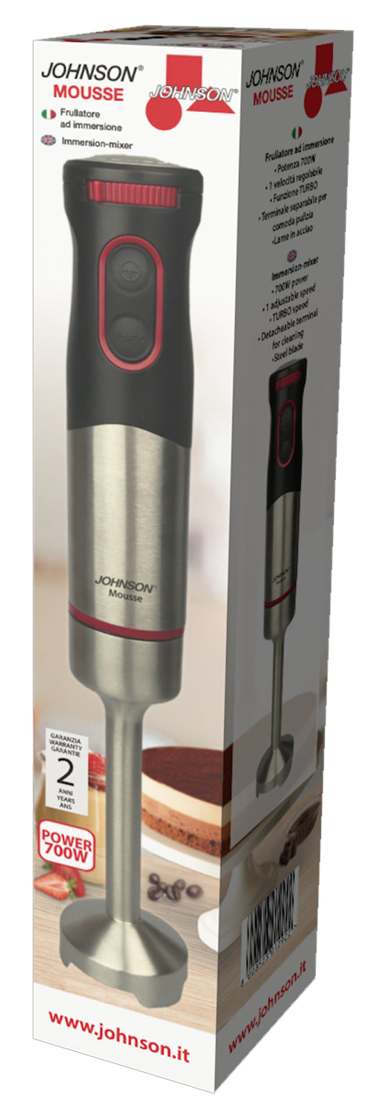 Con il frullatore ad immersione MOUSSE di JOHNSON, godi di una potenza ottimale senza alcuna fatica grazie a un motore da 700 W. Ha un’impugnatura ergonomica con due pulsanti facili da raggiungere, regolazione della velocità, pulsante di avvio e funzione TURBO; preparando così una varietà di piatti in pochissimo tempo. MOUSSE ha la lama in acciaio inox ed è pratico, semplice e veloce per una facile pulizia. DATI TECNICI: Potenza 700-1000 W Frullatore a immersione 2 pulsanti 1 velocità regolabile 1 funzione 'TURBO' Terminale in acciaio inox separabile per facile pulizia Lame in acciaio inox Kb 30” sec Colore: Grigio/Nero/Bordeux Alimentazione 220 – 240V~ 50/60 Hz