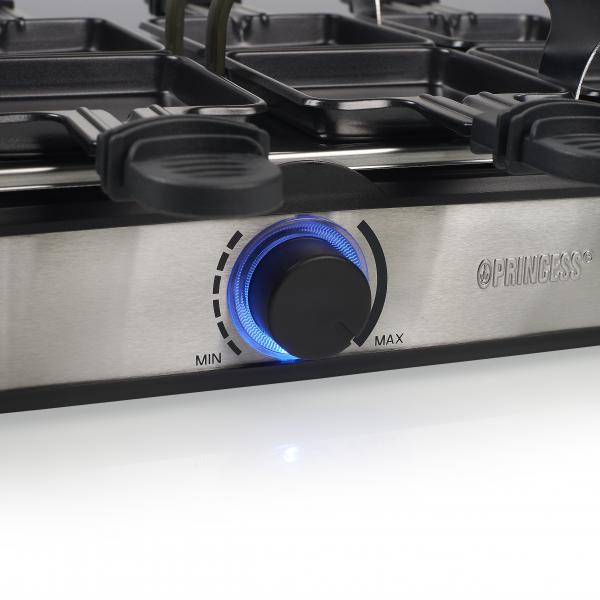 Non potrai annoiarti con la piastra Princess Raclette 8 Grill Deluxe. Puoi scegliere di utilizzare la piastra in modo diverso ogni volta. Puoi girare la teglia in alluminio pressofuso in un istante. E puoi quindi scegliere la piastra per la griglia o per la cottura per preparare i tuoi piatti più gustosi in modi diversi.