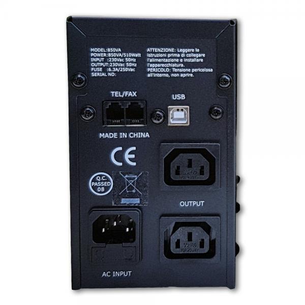 - Gruppo di continuità con potenza nominale 850VA - 510W - Forma d'onda pseudosinusoidale - Con stabilizzatore di tensione AVR - Dotato di 1 batteria 7Ah, garantisce un'autonomia di circa 10' Specifiche - Tensione nominale ingresso: 230 Vac - Frequenza: 50Hz oppure 60Hz - Potenza VA/W: 850VA/510W - Tensione nominale uscita: 230 Vac - Forma d'onda: pseudosinusoidale ottimizzata per alimentazione PC - Tempo di commutazione: ≤10ms - Controllo UPS tramite CPU - Stabilizzatore di tensione AVR - Ampia tolleranza sulla tensione in ingresso senza intervento della batteria - Funzione Auto Restart: ripristino automatico a ritorno di rete - Funzione Cold Start: possibilità di accensione da batteria - Ricarica delle batterie anche a UPS spento - Funzione rete telefonica ed informatica tramite connettore RJ11 - Protezione contro corto circuito, sotto/sovra tensione batteria, sovraccarico Collegamenti - Spina in ingresso: 1 x IEC 320 C14 10A - Prese in uscita: 2 x IEC 320 C13 10A - Protezione rete telefonica ed informatica tramite connettore RJ11 - Porta USB di comunicazione Caratteristiche fisiche - Dimensioni: 163 x 95 x 325 mm - Temperatura operativa: 0-40°C - Umidità relativa: <90% RH senza condensa - Colore: nero Contenuto della confezione: - Gruppo di continuità 850VA - 1 cavo ingresso 10A - 1 cavo uscita 10A - 1 cavo USB e RJ11