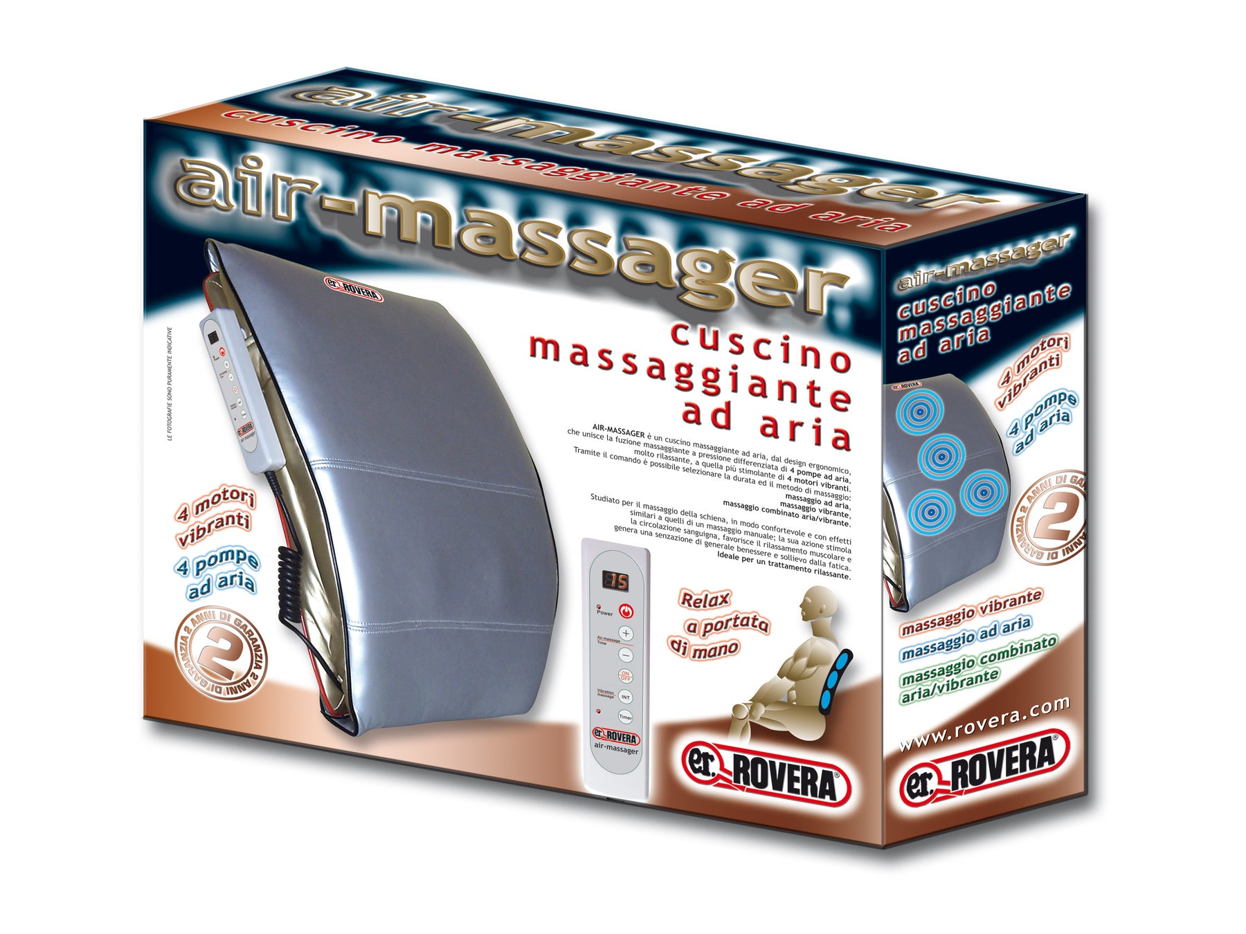 AIR-MASSAGER è un cuscino massaggiante ad aria, dal design ergonomico, che unisce la funzione massaggiante a pressione differenziata di 4 pompe ad aria, molto rilassante, a quella più stimolante di 4 motori vibranti. Tramite il comando è possibile selezionare la durata ed il metodo di massaggio:– Massaggio ad aria– Massaggio vibrante– Massaggio combinato aria/vibrante Studiato per il massaggio della schiena, in modo confortevole e con effetti similari a quelli di un massaggio manuale. La sua azione favorisce il rilassamento muscolare e genera una senzazione di generale benessere e sollievo dalla fatica. Ideale per un trattamento rilassante. CARATTERISTICHE TECNICHE: Alimentatore (incluso) :in AC 100-240V – out DC12V/1,2APotenza: 14,4WDimensioni: 47 x 37 x 13 cm Peso: 2 Kg4 motori vibranti4 pompe ad ariaMassaggio ad aria regolabileMassaggio vibrante regolabileTimer 15/30/45/60 min.IN OMAGGIO: Massaggiatore Portatile ad azione Vibrante, studiato per il massaggio di ogni parte del corpo e per un trattamento rilassante