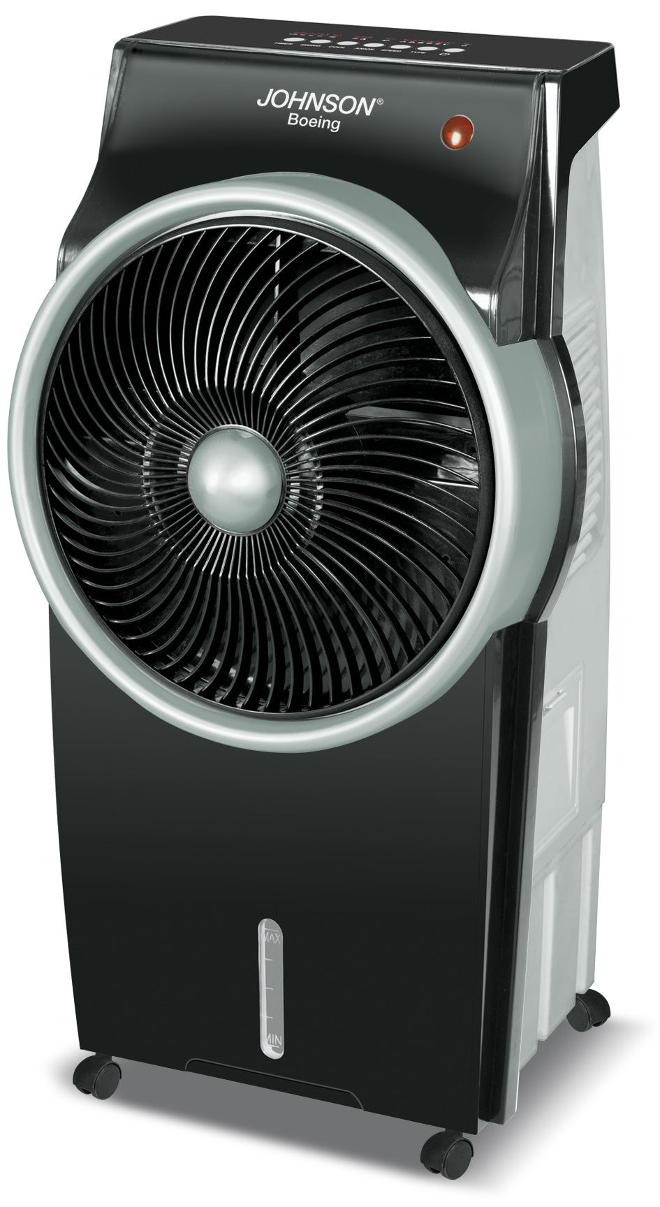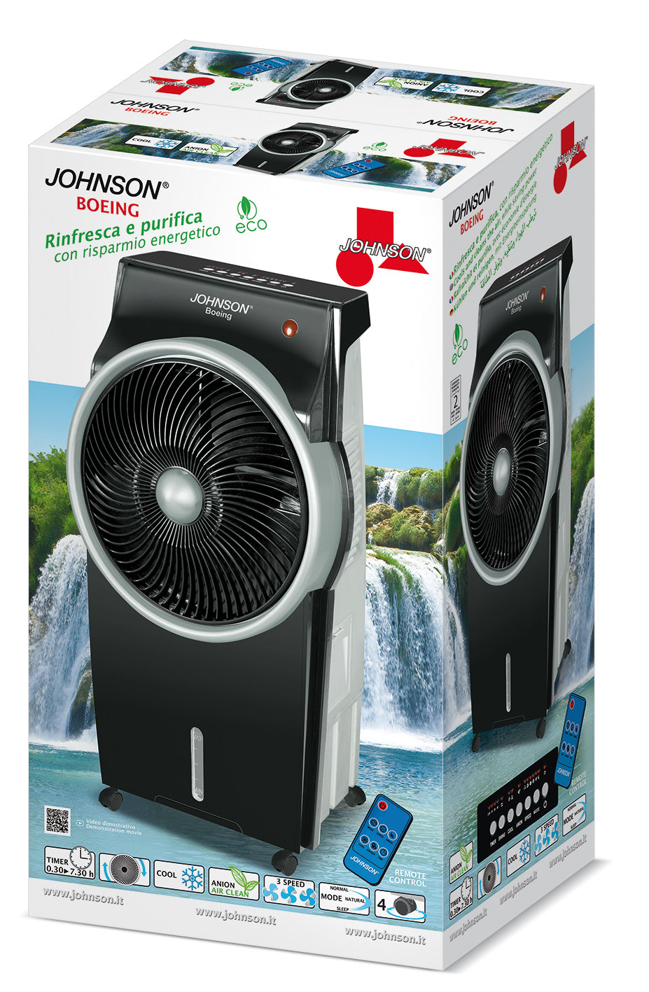 Johnson BoeingBOEING, di JOHNSON Elettrodomestici, è il nuovo modo pratico ed efficace per combattere la calura estiva, rinfresca l’aria creando unatemperatura piacevole senza utilizzare refrigerante chimico, a differenza dei climatizzatori tradizionali, e senza dover ricorrere a costose e complicate installazioni. Un’ ambiente più fresco, è ottenuto grazie ad un rinfrescamento immediato dell’aria, BOEING sfruttando il principio di evaporazione, utilizza semplicemente acqua e ghiaccio per rinfrescare l’aria calda. E’ comandabile a distanza, ha un serbatoio di 8 litri che garantisce una elevata autonomia, 95 W di potenza, 3 velocità e un diffusore rotante per assicurare la massima efficienza di raffreddamento in tutto l’ambiente. Il timer integrato consente di impostare il tempo di funzionamento che si desidera da 30 minuti fino a 7 ore e 30 minuti, 3 sono le modalità di funzionamento: “normal” in continuo secondo la velocità impostata, “natural” attivazione, pausa, velocità alternata in automatico e “sleep” consigliata per la notte. La funzione “anion”, immette nell’ambiente elettroni caricati negativamente mediante l’applicazione di un alto voltaggio negativo che neutralizzano sino al 99% i virus, e i batteri delle muffe.Il sistema “anion” è anche in grado di neutralizzare in poco tempo le sostanze che generano una condizione di malessere per il nostro organismo creando un ambiente più salubre. Per agevolare il trasporto e lo spostamento da un locale all’altro si hanno 2 maniglie e 4 ruote girevoli a 360 gradi.Per un corretto uso dell’apparecchio utilizzare solo acqua distillata o denaturalizzata e svuotare il serbatoio dopo l’utilizzo. Dati tecnici:Rinfrescatore d’ariaPotenza 95WCapacità 8 LColore Nero argento3 velocitàTelecomando,TimerPurifi catore d’ariaDiffusore rotante motorizzatoClasse climatica T
