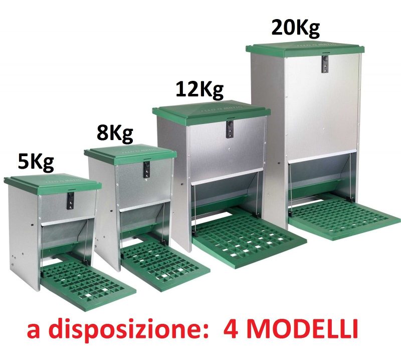 Di recente abbiamo selezionato e introdotto sul mercato questa nuova mangiatoia automatica a pedale per volatili.Scoprite Voi stessi i miglioramenti e i vantaggi di questo nuovo prodotto!Con questa mangiatoia, non avrete più il fastidio degli animali nocivi, come topi, ratti ed altri uccelli che consumano e inquinano il mangime dei vostri volatili.La mangiatoia può essere utilizzata anche all’esterno, mantenendo il mangime protetto e ben asciutto.Come viene azionata la mangiatoia automatica: quando i vostri volatili salgono sulla pedana a pedale, la parte bassa della mangiatoia si apre, garantendo l’accesso al mangime.I suoi vantaggi: maggiore resistenza alle intemperie, grazie ad una migliore impermeabilità; vaschetta della mangiatoia con gli angoli arrotondati per evitare lo sviluppo di muffe; forma della vaschetta concepita in modo che i volatili non possano rasparvi dentro grazie alla presenza di divisori e al bordo anti-spreco in nylon antiusura; rifornimento del mangime più facile, grazie al coperchio che resta aperto in maniera verticale. Una volta premuto, il coperchio attiva un meccanismo automatico di bloccaggio/chiusura; varie possibilità di regolazione per l’apertura della mangiatoia a seconda del peso del volatile. Il peso minimo regolabile è di 250g sino ad un massimo di 2Kg (per peso superiore, la pedana deve venire fissata sul valore di 2Kg).Caratteristiche costruttive: le parti in plastica e la lamiera zincata sono fabbricati con materiali di alta qualità, tutti resistenti ai raggi UV e molto durevoli; la lamiera zincata ha uno spessore di ben 1,00 mm, rendendo la mangiatoia molto stabile; pedana (pedale) in plastica molto resistente, sulla quale non si possono accumulare gli escrementi;prodotto assemblato con grande precisione, senza giunture né fessure.Misure: 28 x 26 x 45 CMPeso: 5,5 KgCapacità: 8 Kg