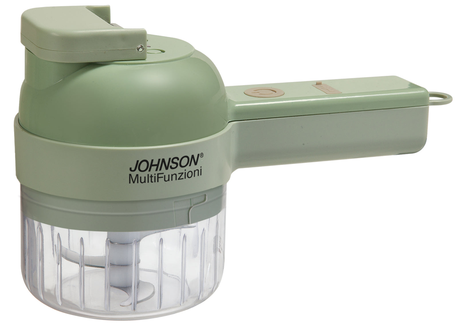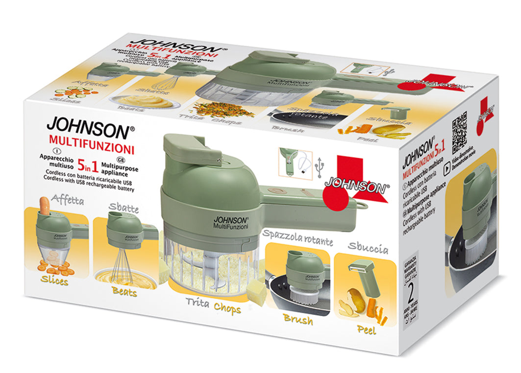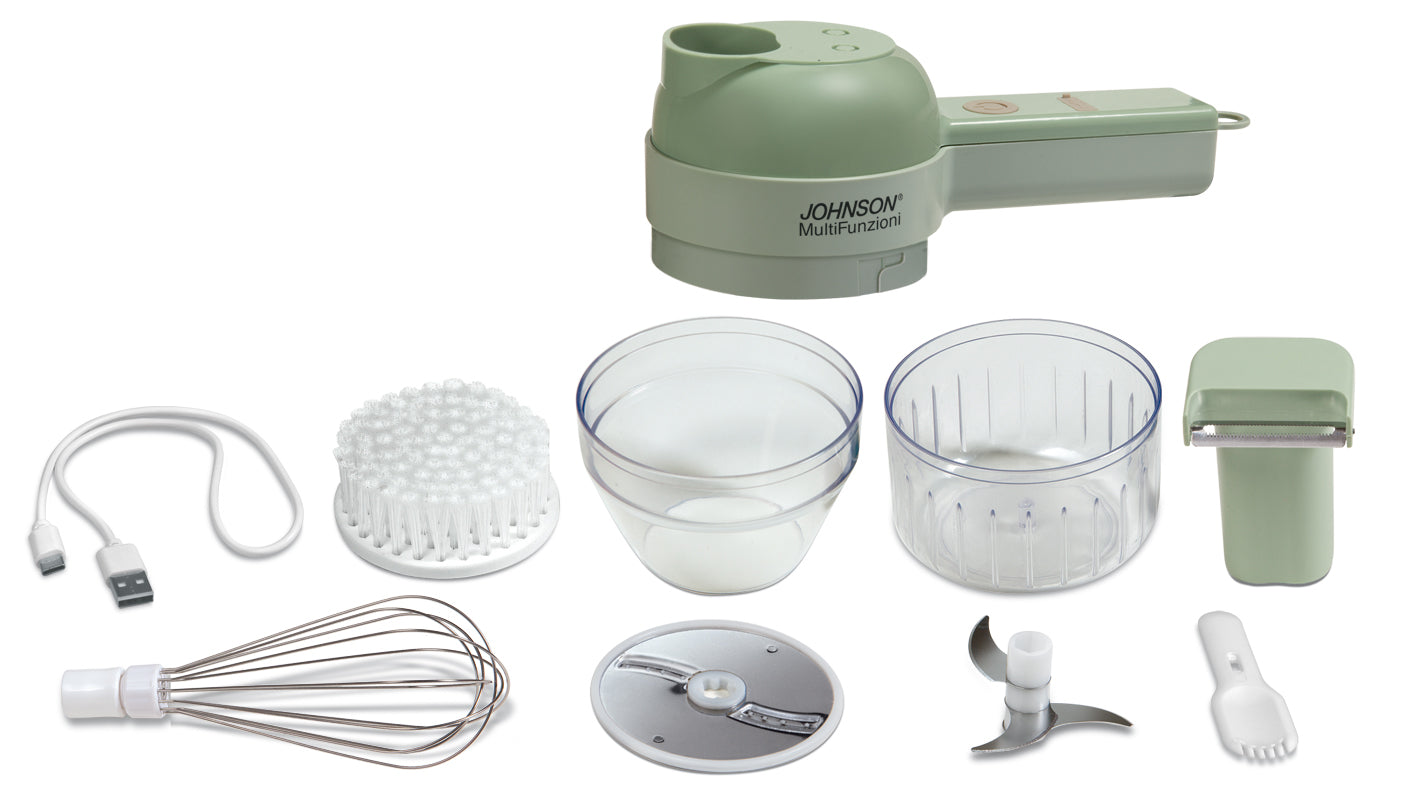 "MULTIFUNZIONI 5 in 1 di JOHNSON Elettrodomestici è il nuovo apparecchio multiuso con batteria ricaricabile a ioni di litio.Può essere ricaricato con alimentazione elettrica oppure con alimentazione USB 5V.Con un elegante colore verde MULTIFUNZIONI grazie agli accessori di cui dispone può affettare, tritare, sbucciare e sbattere, inoltre dispone anche di una spazzola setolata per pulire le pentole.DATI TECNICI:• APPARECCHIO MULTIUSO 5 IN 1• Batteria ricaricabile a ioni di litio 3,7V 1200mAh• Ricaricabile con alimentazione elettrica 3,7V—-15W o con alimentazione USB 5V• Affetta, trita, sbuccia, sbatte• Spazzola pulisci pentole• Colore: verde"