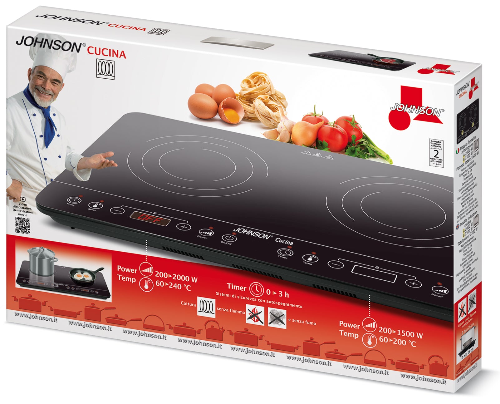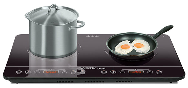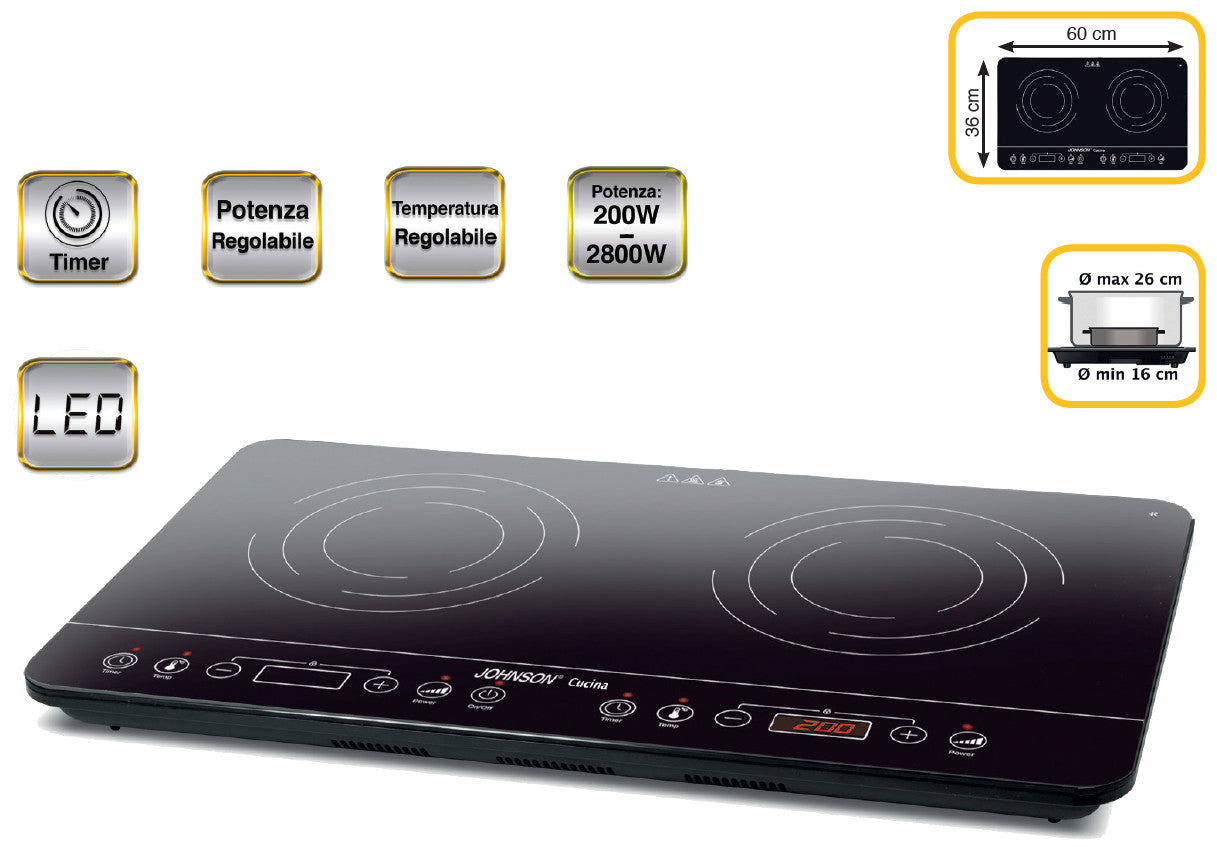 CUCINA di Johnson è un comodo piano di cottura a induzione a due zone, con una potenza massima di 2800 W, ideale per coppie moderne e piccole famiglie. L’impostazione della temperatura è molto utile per mantenere a un caldo costante le vostre cotture a bagnomaria, gli stufati e i bolliti. La particolarità è la possibilità di cottura programmata, in questo modo potrete scegliere la potenza o temperatura che desiderate assieme al tempo di cottura, affinché i vostri piatti cuociano perfettamente per il tempo previsto. Questa funziona si rivela molto pratica per la cottura di pasta o per la cottura al vapore delle verdure. La regolazione dei diversi parametri di cottura avviene tramite la superficie touch della piastra. Pensata e creata per pentole di diametro tra i 16 e i 26 cm, la piastra Induzione offre uno spazio sufficiente per preparare il pranzo o la cena. Il design moderno e compatto rende la piastra a induzione Johnson un oggetto semplice, piacevole, moderno e utile la cui superficie in vetro permette di minimizzare i tempi della pulizia. Perfetta per le cucine piccole, in vacanza, in camper o in campeggio. Johnson è costantemente impegnata all’eco sostenibilità dell’ambiente: Cucina di Johnson ne è parte integrante! non usa gas, non usa fiamme e non emette fumi.Dati tecnici:• Doppio fornello a Induzione• Potenza regolabile• Temperatura regolabile• Riconoscimento pentole non adatte• Timer 0-3h -Termostato• Pannello di controllo elettronico con display led e comandi touch• Sistemi di sicurezza con autospegnimento• Piano cottura in vetro, resistente ad urti e alte temperature• Facile da pulire• Prodotto che salvaguarda l’ambiente: non usa gas, non usa fiamme e non emette fumo• Piedini antiscivolo• Potenza max 2800 W• Potenza zona A: da 200 a 1400 W• Temperatura zona A: da 60 a 240°C• Potenza zona B: da 200 a 1400 W• Temperatura zona B: da 60 a 200°C• Alimentazione 220 – 240V~ 50/60 Hz