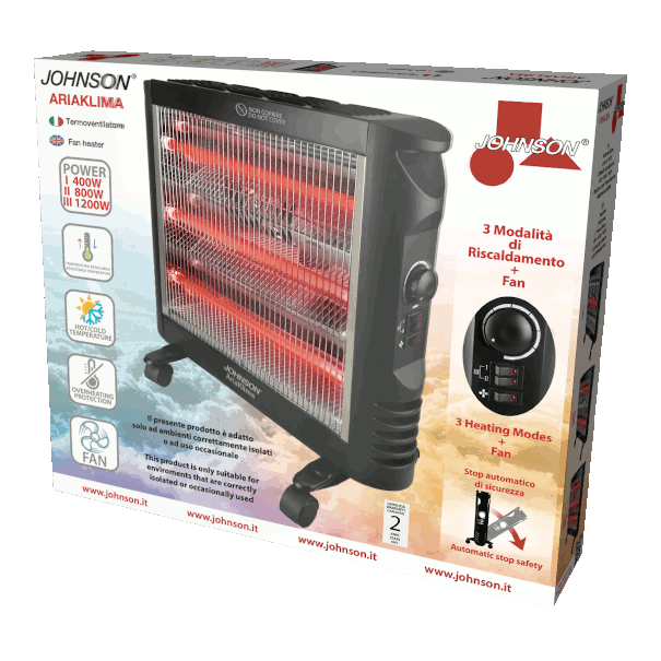 STUFA AL QUARZO VENTILATAPotenza max 1200w – 3 modalità di riscaldamento 400w – 800w – 1200w – protezione contro il surriscaldamento – stop automatico di sicurezza antiribaltamento – temperatura regolabile – ventola irradia calore + fan – scocca in metallo verniciato con laterali in plastica – termoresistente e maniglie integrate – spina SCHUKO con massa a terra Potenza: 400 - 1200 W; 3 modalità di riscaldamento; Sicurezza: Spegnimento automatico in caso di ribaltamento; Protezione contro il surriscaldamento. Dimensioni prodotto: 550 x 270 x 495 mm; Peso imballo + prodotto: 4.5 Kg