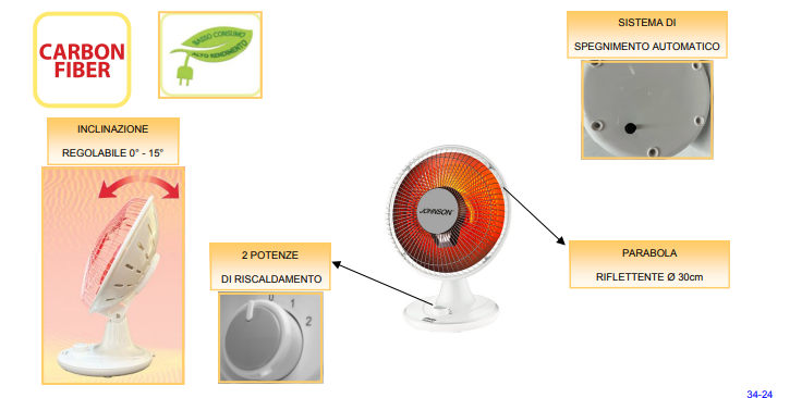 Stufa in fibra di carbonioPotenza: 450-900 WBasso consumo a risparmio energetico ad alta efficienza termica – Potenza regolabile – Timer 0 -120 minuti – Inclinazione regolabile – Oscillazione automatica selezionabile – Altezza regolabile 70 – 90 cm – Parabola riflettente e griglia in metallo – Maniglia di trasporto – Sistema di sicurezza di spegnimento automatico in caso di ribaltamento dell’apparecchioColore: Bianco 450 - 900 W, sistema di spegnimento automatico, inclinazione regolabile. Potenza: 450-900W, Dimensioni: 35 x 35 x 70/90 cm, Peso confezione: 3.5 Kg."