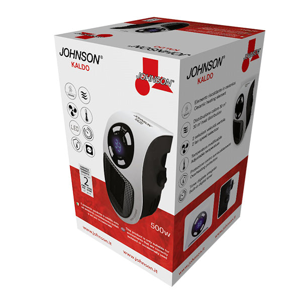 Termoventilatore da presaPotenza: 500 WElemento riscaldante in ceramica a basso consumo – Distribuzione calore 30 m³ – 2 selezioni di velocità ventola – Temperatura regolabile a gradi con lettura digitale – Interruttore On/Off – Timer digitale integrato – Display a LED – Possibilità di rotazione della spina – Sicurezza: sistema anti surriscaldamento.Colore: Bianco/Nero