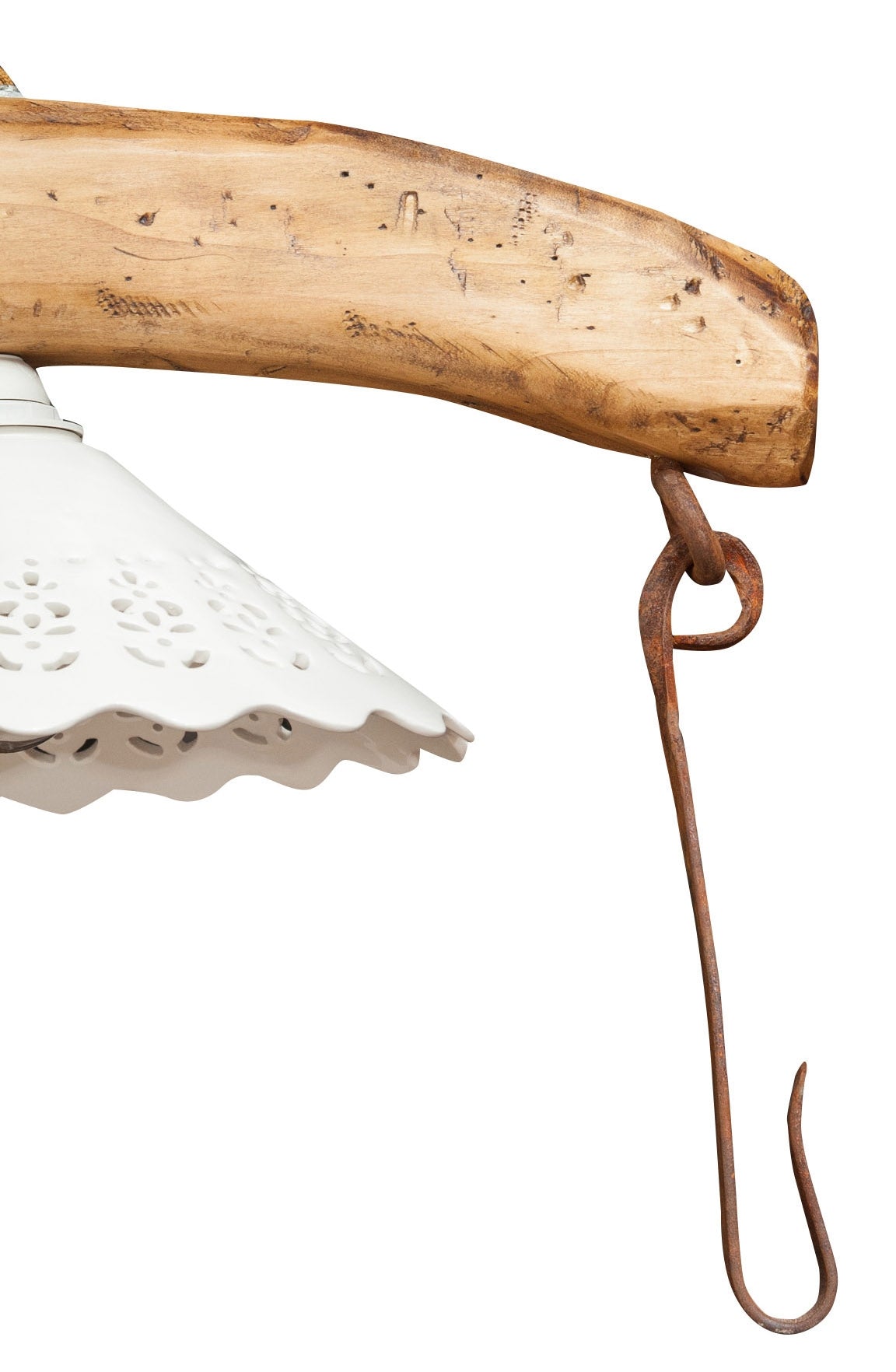 Giogo in legno massello di tiglio di dimensioni L161xPR30xH41 cm con ganci di traino in ferro. Elettrificato, con due piatti paralume in ceramica si trasforma in un originalissimo lampadario in grado di donare un tocco di stile Country e una soffusa e calda illuminazione a qualsiasi ambiente Grazie alla sapiente e scrupolosa lavorazione artigianale Made in Italy e alla cura dei minimi particolari, sapientemente invecchiato e asciato a mano, presenta tutte le caratteristiche del vecchio attrezzo utilizzato dalle vacche. Interamente lavorato a mano, ogni articolo è da considerarsi un pezzo unico, ideale per chi ama arredare ambienti rustici.