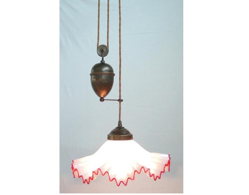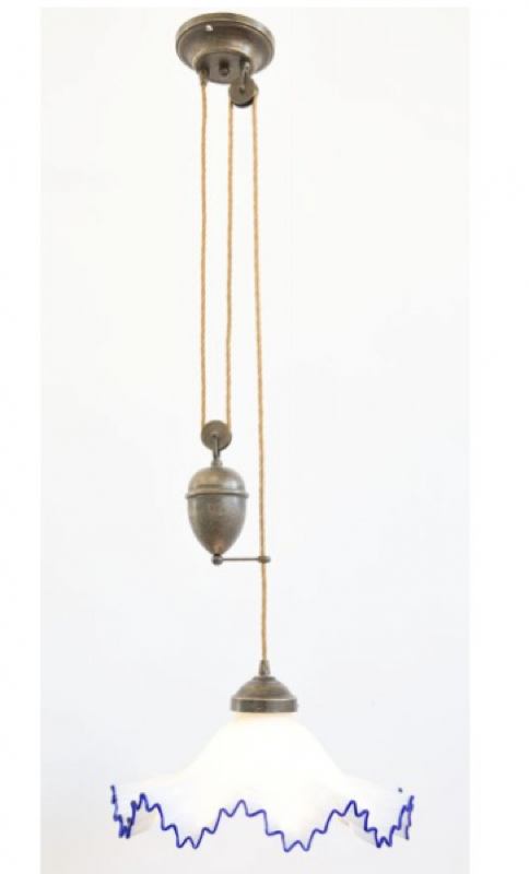 Un affascinante meccanismo di carrucole e pesi di bilanciamento, fa scorrere il cavo elettrico Old-Style dal tipico design a funicella, permettendone la regolazione.