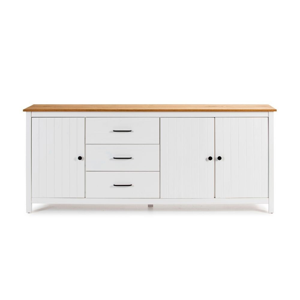 Credenza Miranda con 3 ante e 3 cassetti in legno massiccio bianco con top pino