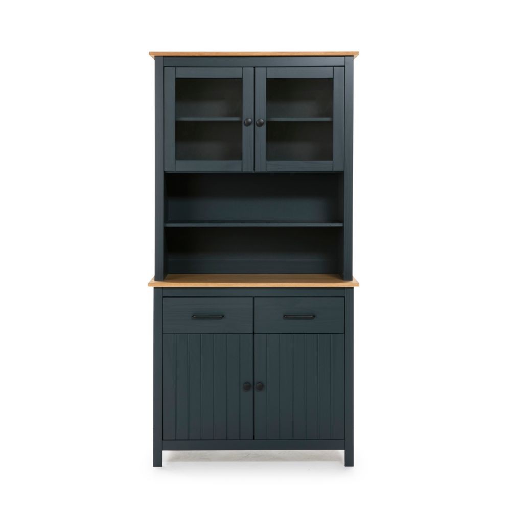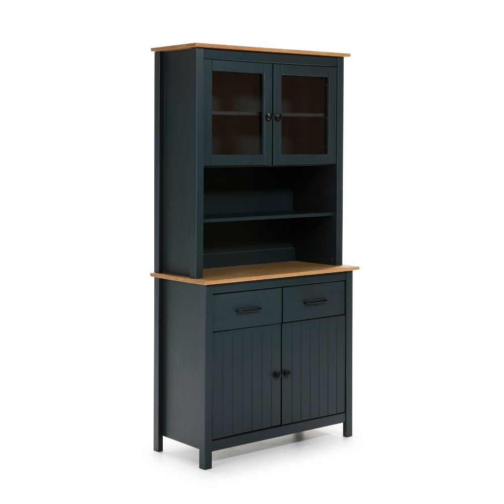 Credenza Miranda con vetrina 4 ante e due cassetti in legno massiccio blu e rovere