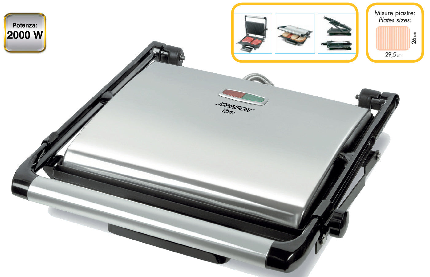 GRIGLIA A PIASTRE ELETTRICA 2000 WATTGRIGLIA A PIASTRE ELETTRICA “GRILL E SANDWICH PRESS” STRUTTURA IN ACCIAIO CON GUSCI CROMATI PIASTRE CON SUPERFICIE ANTIADERENTE PRATICO MANIGLIONE PRESSA ALIMENTI DISTANZA TRA LE PIASTRE REGOLABILE INDICATORI LUMINOSI CASSETTO RACCOGLI GRASSO AVVOLGICAVO POTENZA 2000 WATT DIMENSIONI PIASTRE CM 29,5 X 26Dati tecnici:- Potenza 2000 W- Struttura in acciaio- Piastre con superficie antiaderente- Pratico maniglione pressa alimenti- Distanza tra le piastre regolabile- Indicatore luminoso- Regolatore di temperatura- Cottura a piastra singola o doppia- Piastre asportabili di facile pulizia