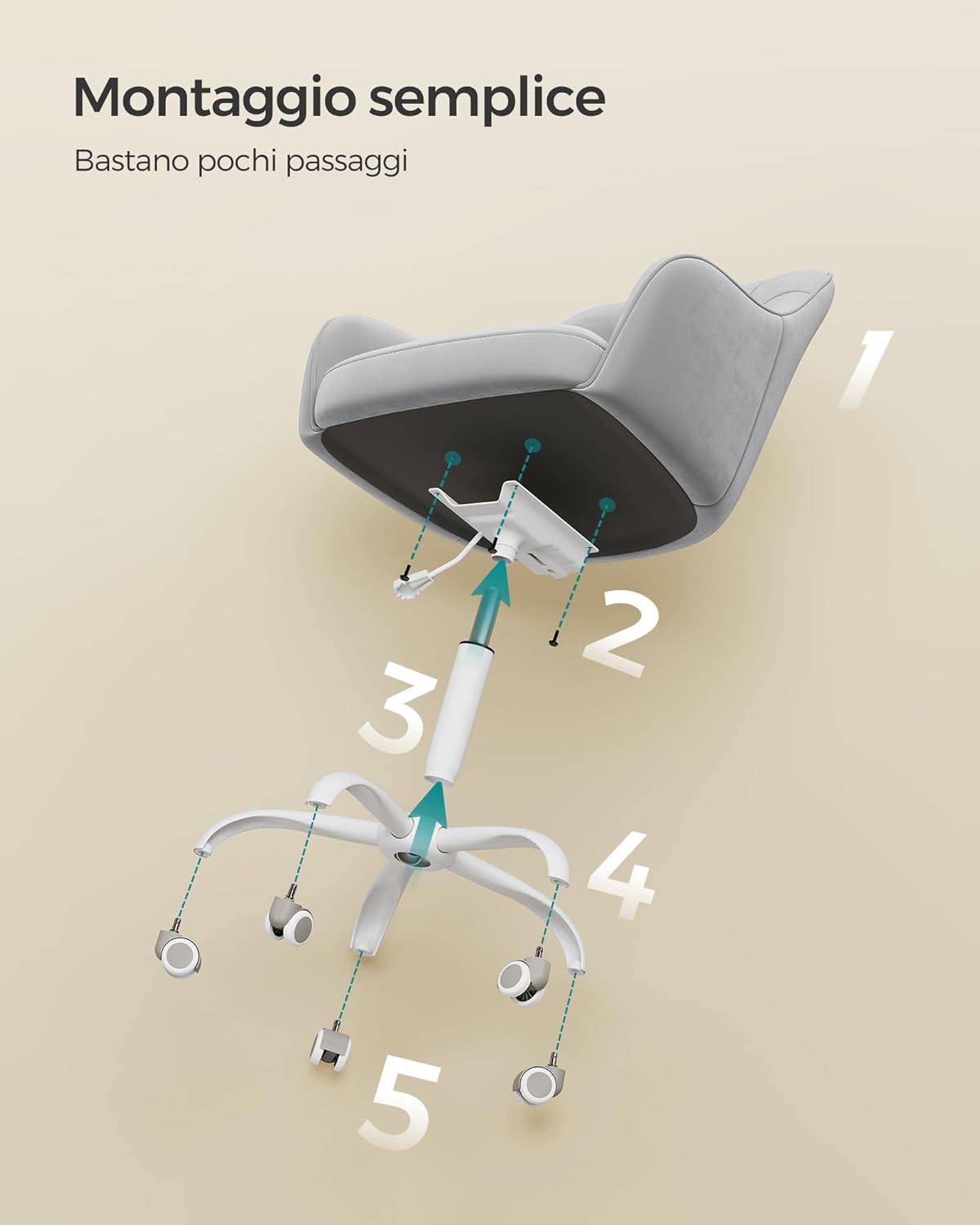 - [Montaggio facile] Fissare il supporto della seduta sotto il sedile con le viti, installare il pistone a gas e le rotelle, la sedia da scrivania è pronta in pochi semplici passaggi